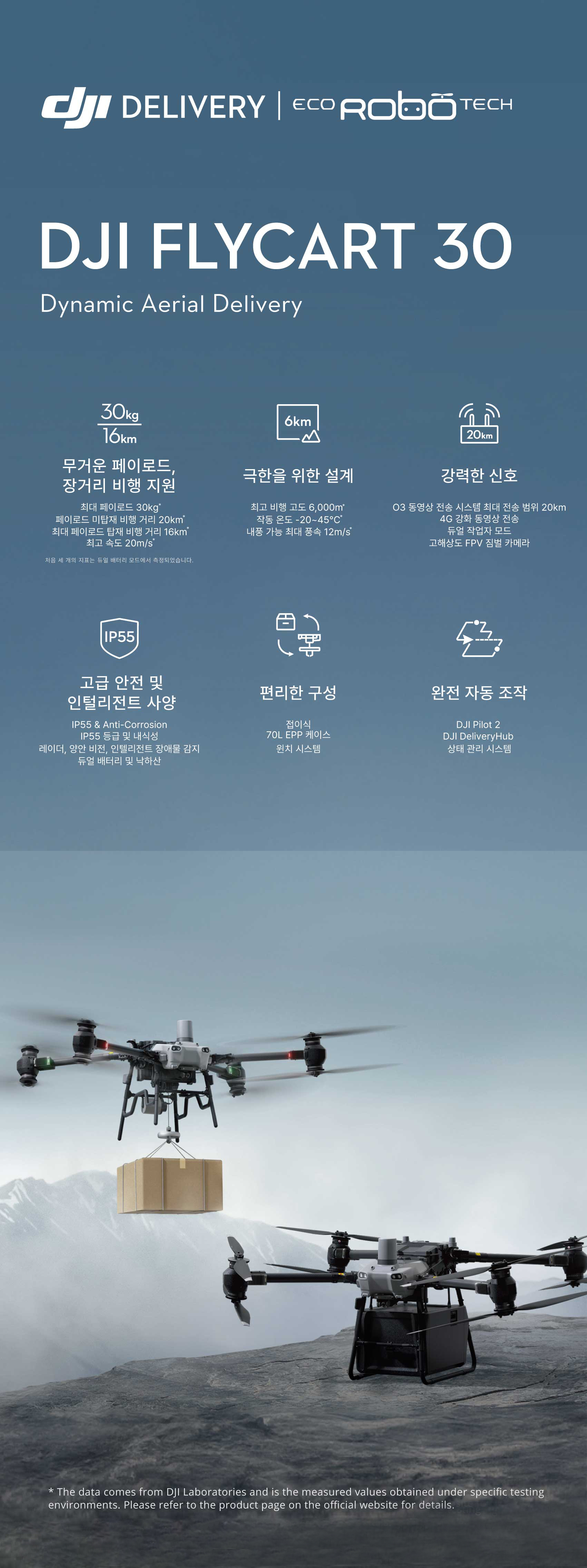 DJI FlyCart 30, 강력한 신호와 인텔리전트 사양을 포함한 장거리 헤비 리프터 DJI FlyCart 30 모델은 '카고 모드'와 '윈치 모드'를 지원하며, 기존의 물류 배송 한계를 넘어 안전하고 경제적이면서 효율적인 항공 배송 솔루션을 제공합니다.