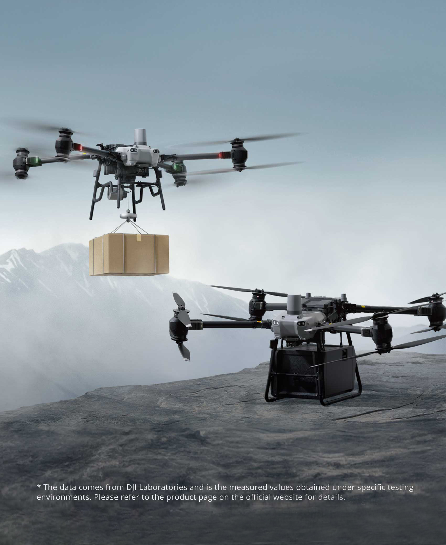 물품 배송을 위한 드론, DJI FlyCart 30, 강력한 신호와 인텔리전트 사양을 포함한 장거리 헤비 리프터 DJI FlyCart 30 모델은 '카고 모드'와 '윈치 모드'를 지원하며, 기존의 물류 배송 한계를 넘어 안전하고 경제적이면서 효율적인 항공 배송 솔루션을 제공합니다.