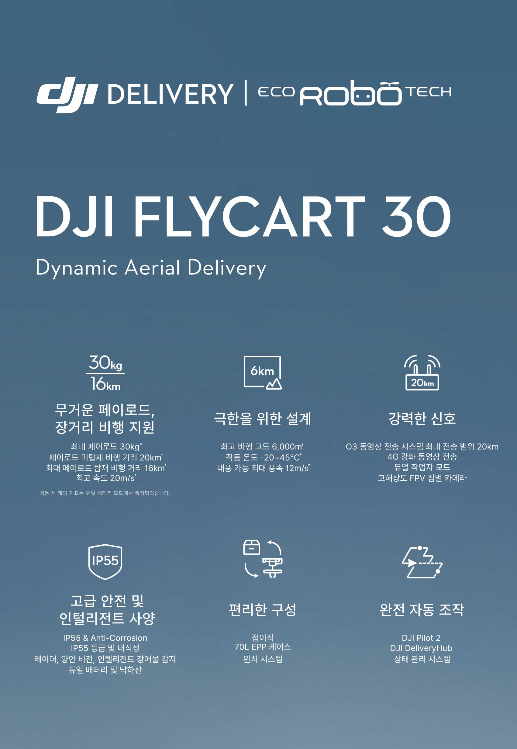 물품 배송을 위한 드론, DJI FlyCart 30, 강력한 신호와 인텔리전트 사양을 포함한 장거리 헤비 리프터 DJI FlyCart 30 모델은 '카고 모드'와 '윈치 모드'를 지원하며, 기존의 물류 배송 한계를 넘어 안전하고 경제적이면서 효율적인 항공 배송 솔루션을 제공합니다.